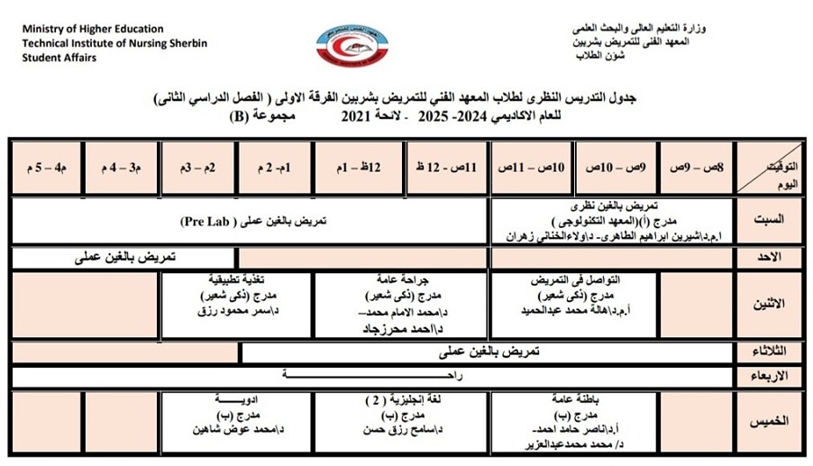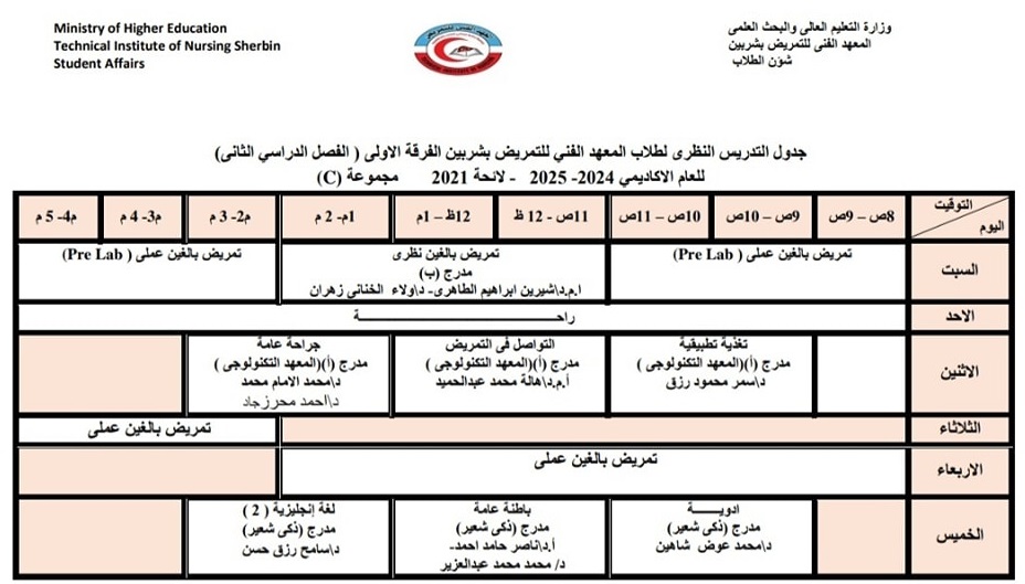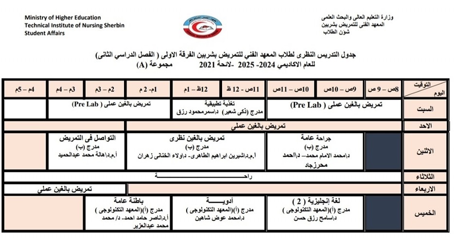 الجدول الدراسى لطلاب الفرقة الثانية بالفصل الدراسي الثاني من العام الأكاديمي ٢٠٢٥/٢٠٢٤
