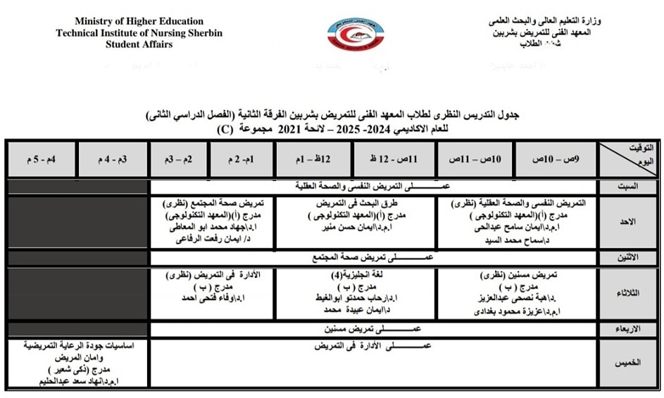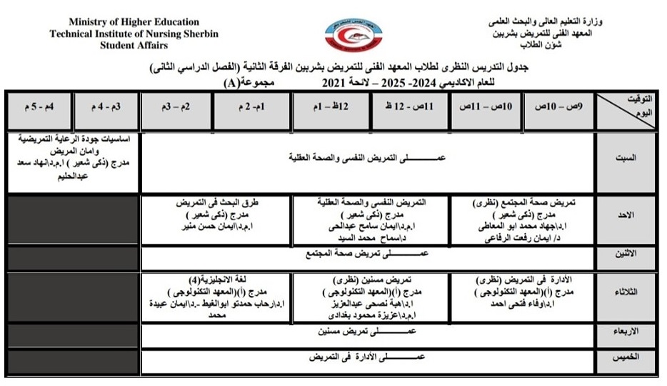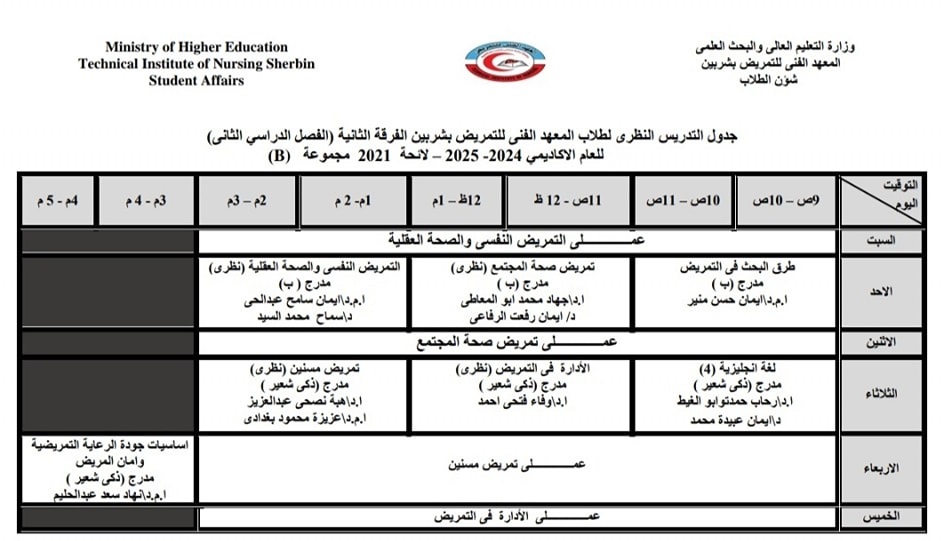 الجدول الدراسى لطلاب الفرقة الثانية بالفصل الدراسي الثاني من العام الأكاديمي ٢٠٢٥/٢٠٢٤